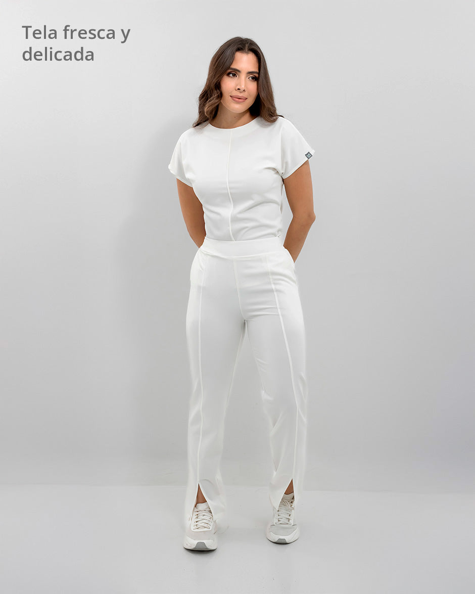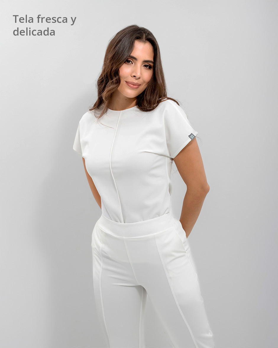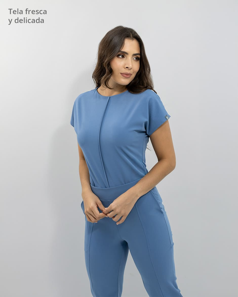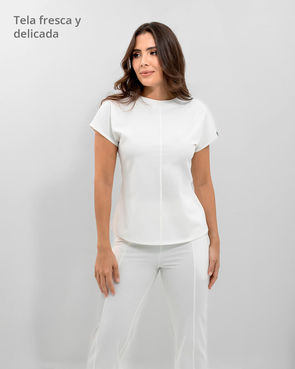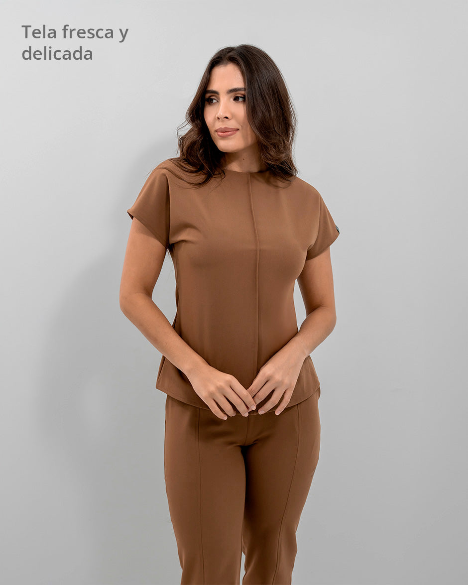 Blusa cuello redondo con manga japonesa y pliegue frontal que le da un toque de elegancia y sobriedad.