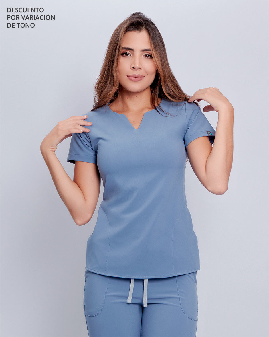 La referencia NEW MOON es un blusa de manga corta, con bolsillos laterales y un cuello que tiene un diseño diferente al clásico cuello en V. Es una opción básica que puede complementar tus scrubs de manera versátil.