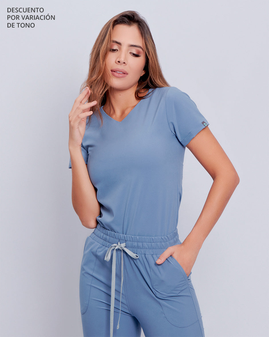 La referencia NEW SPACE es una blusa de manga corta con escote sutil y sofísticado en forma de V. Es una prenda que jamás pasará de moda y que podrás combinar fácilmente para darle dinamismo a tus scrubs.