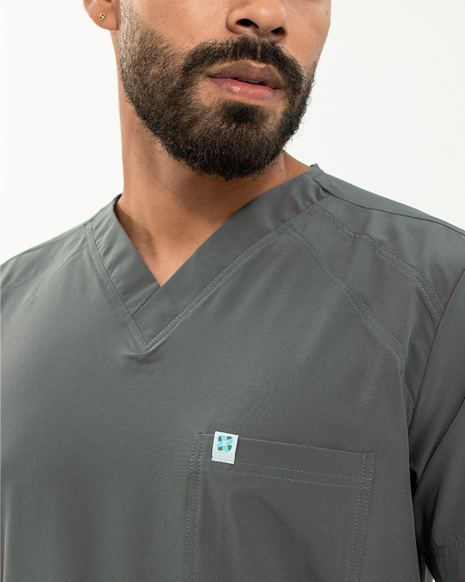 La referencia PLUTÓN es una camisa con silueta ´´regular fit´´. El cuello es tipo V . Cuenta con un bolsillo a la altura del pecho y un diseño en cortes en la parte de los hombros.