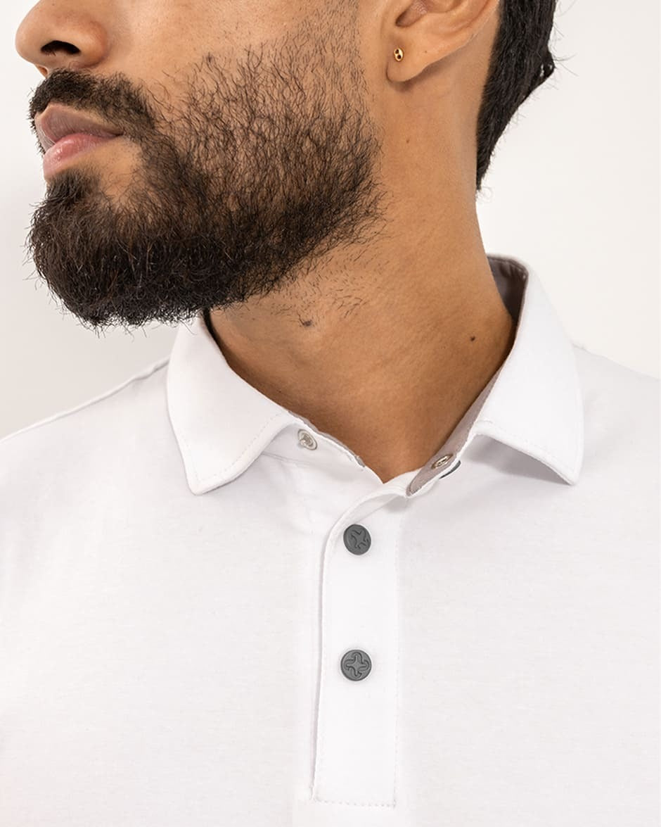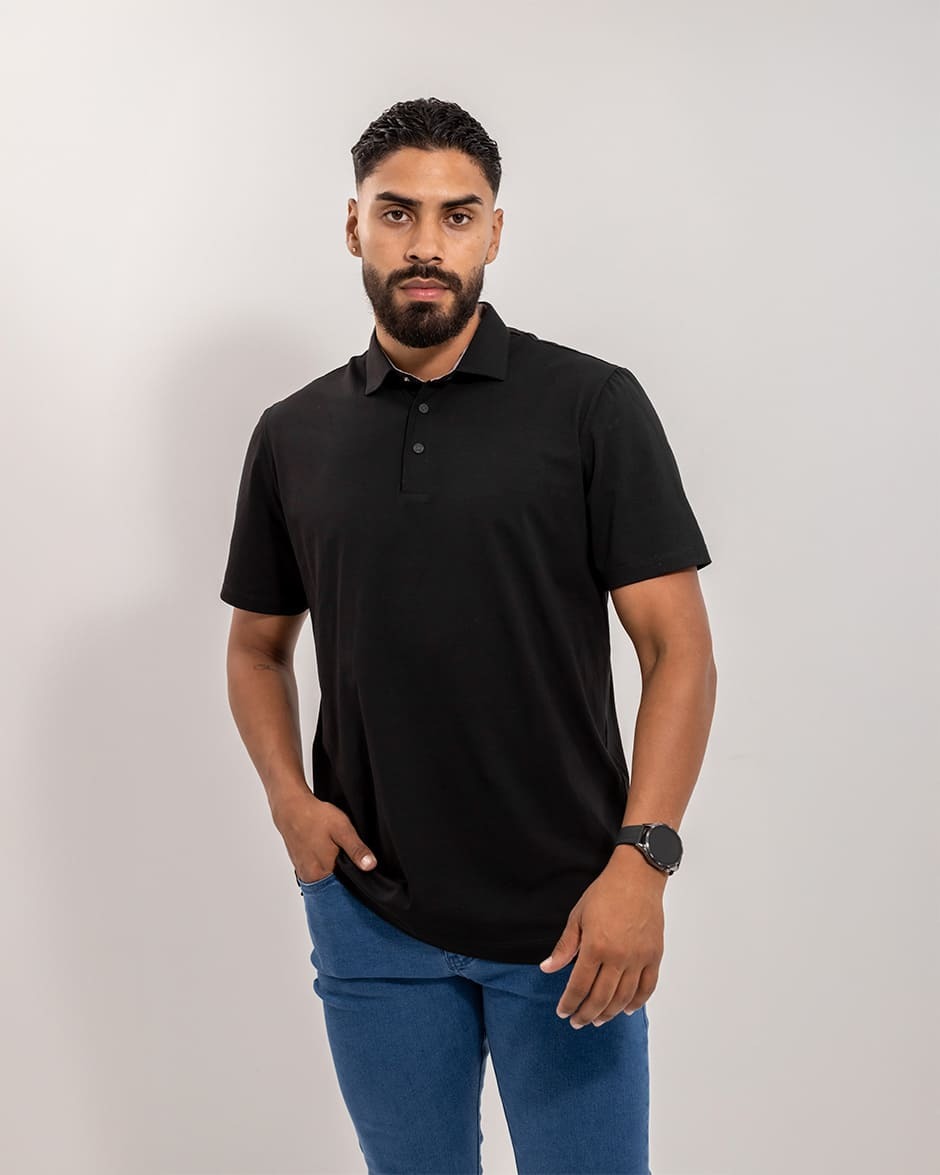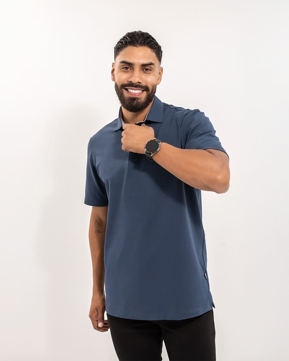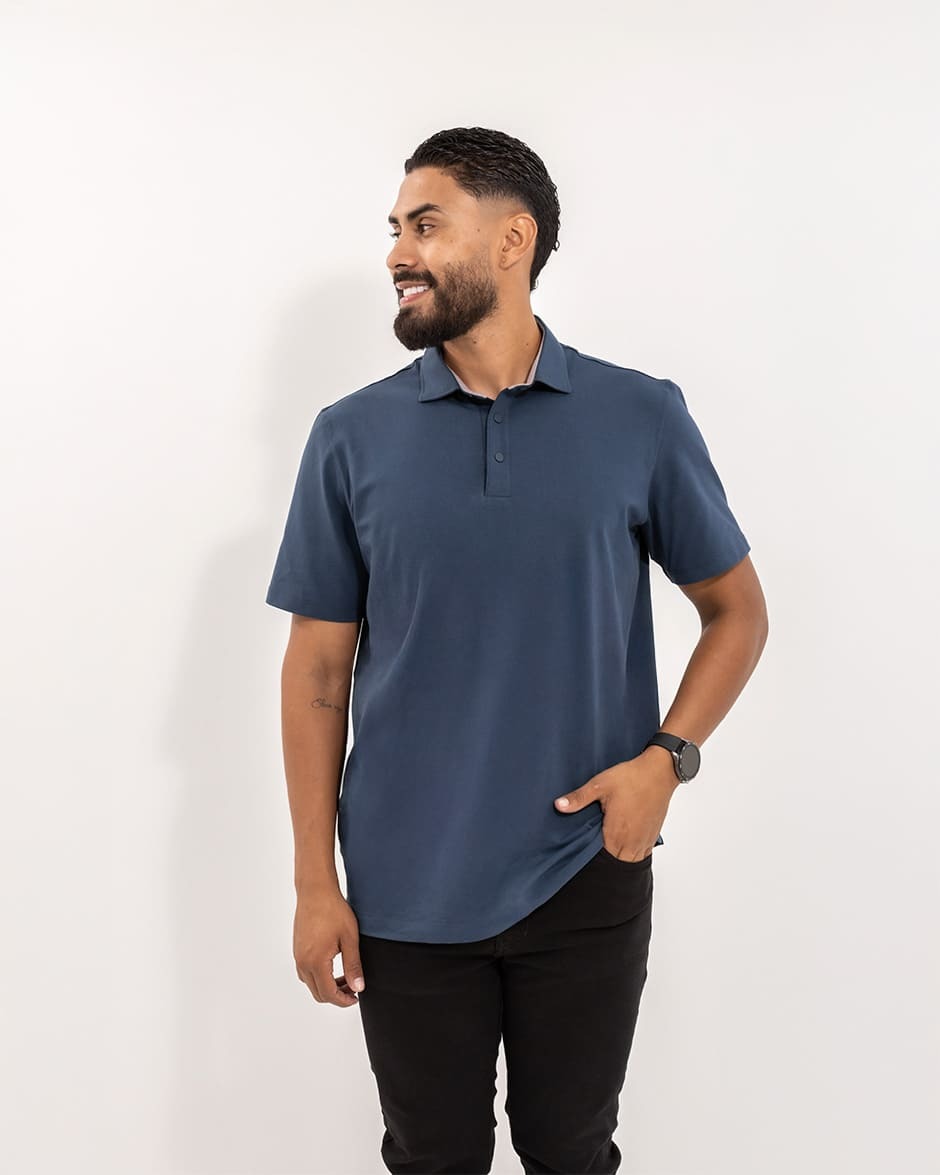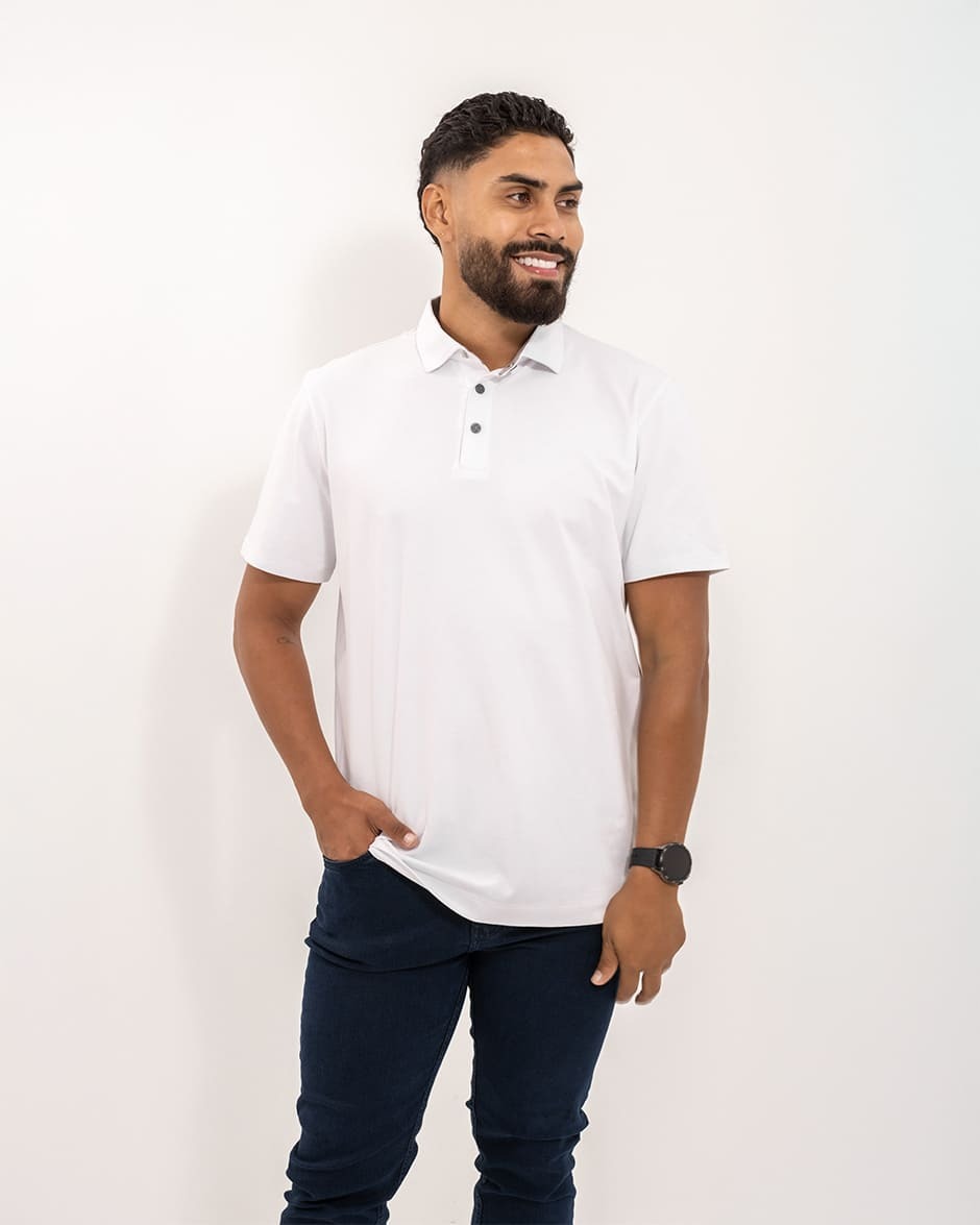Camiseta polo antifluido con botón tipo broche en cartera, fabricada en una tela fresca de algodón con elastano.