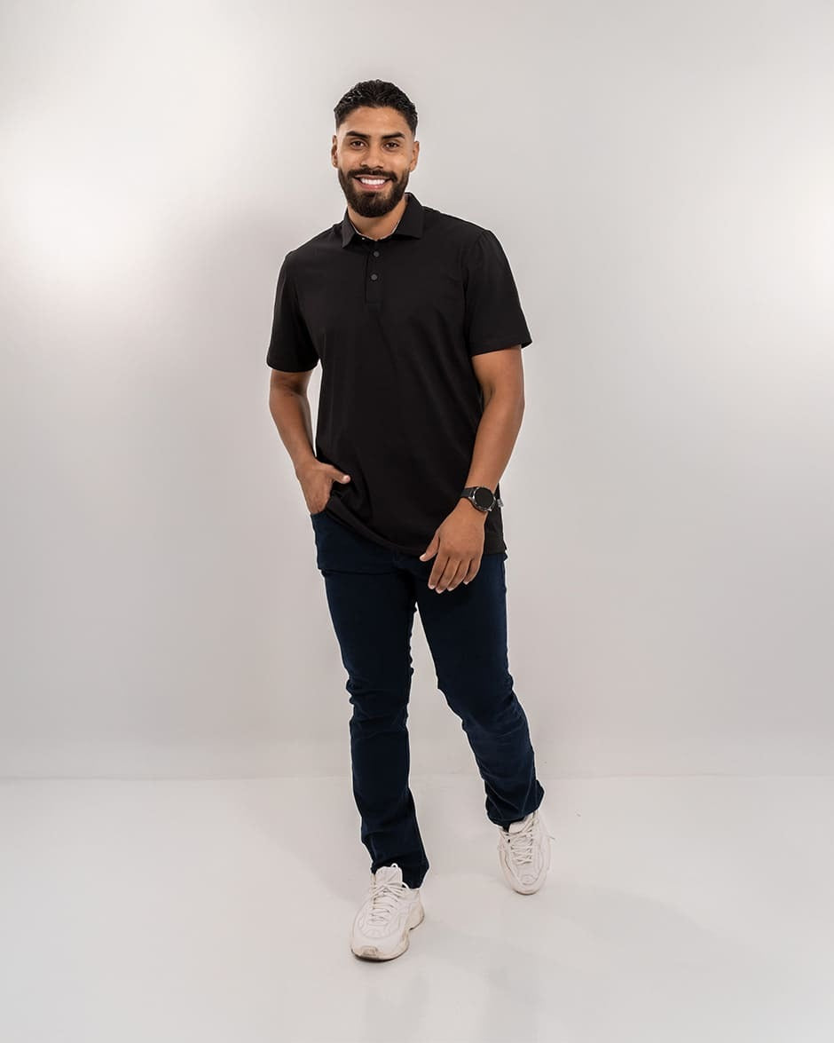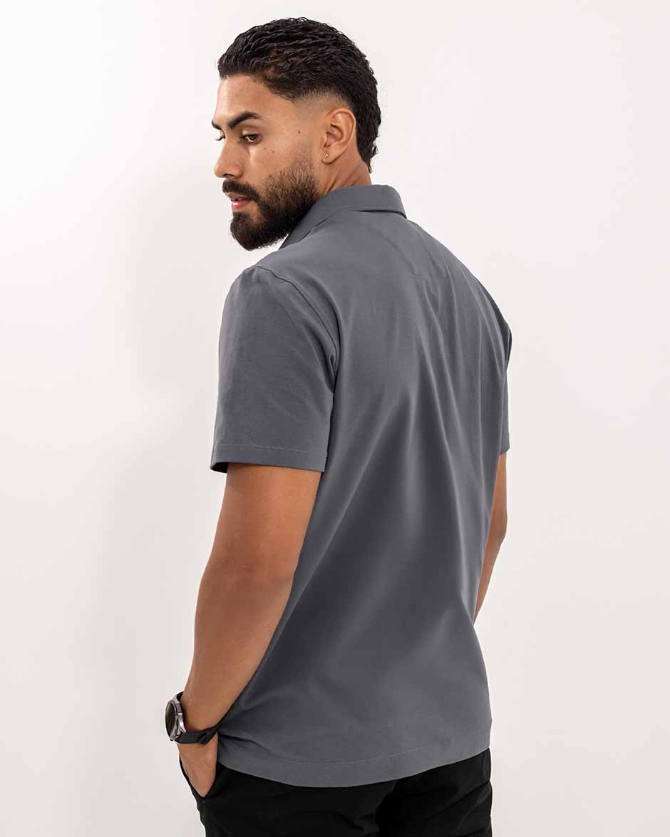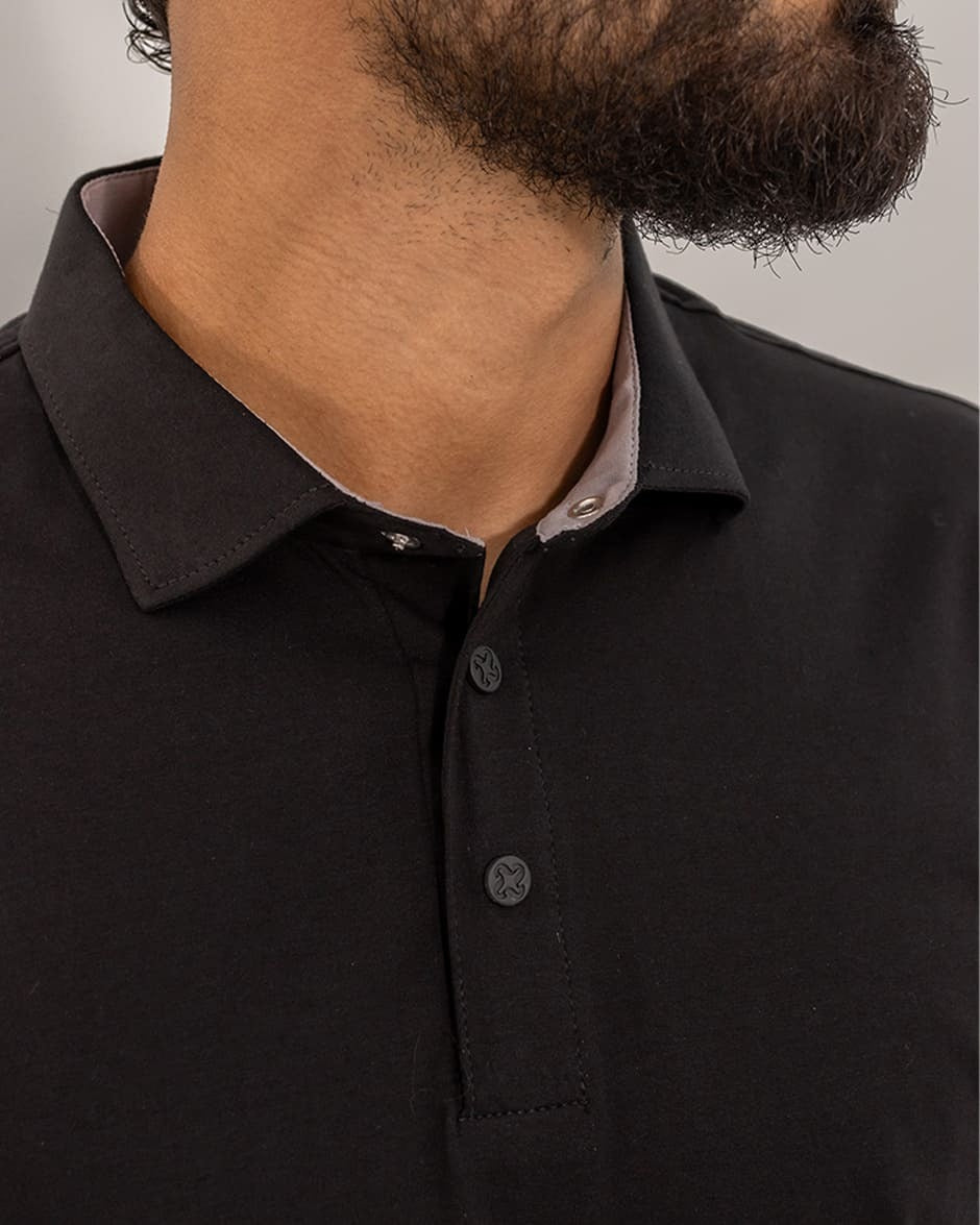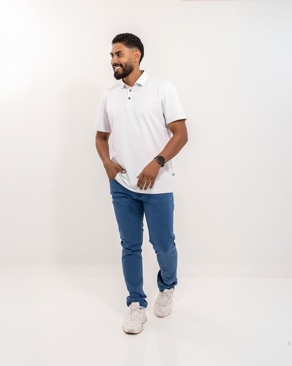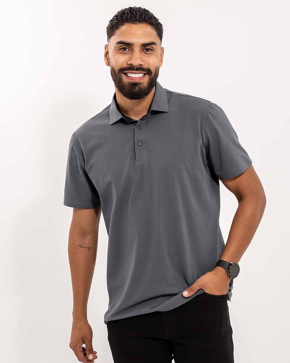 Camiseta polo antifluido con botón tipo broche en cartera, fabricada en una tela fresca de algodón con elastano.