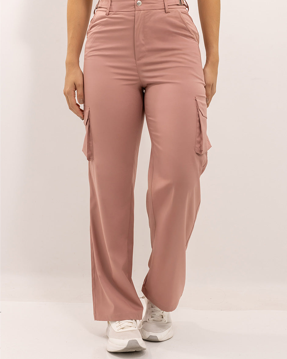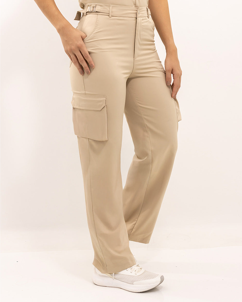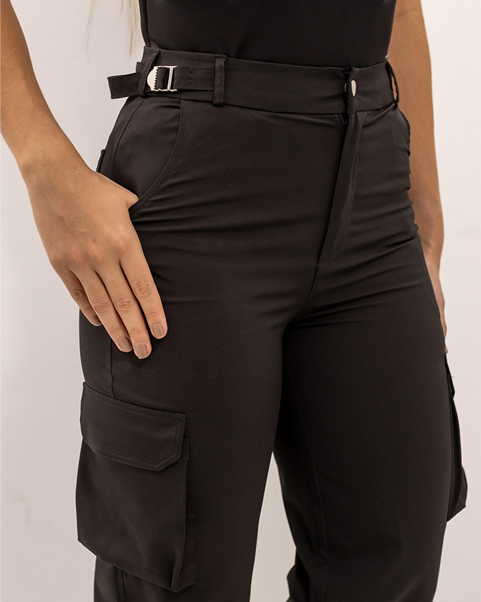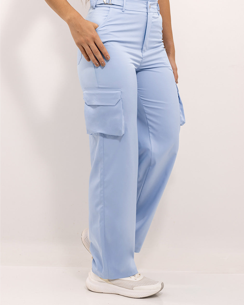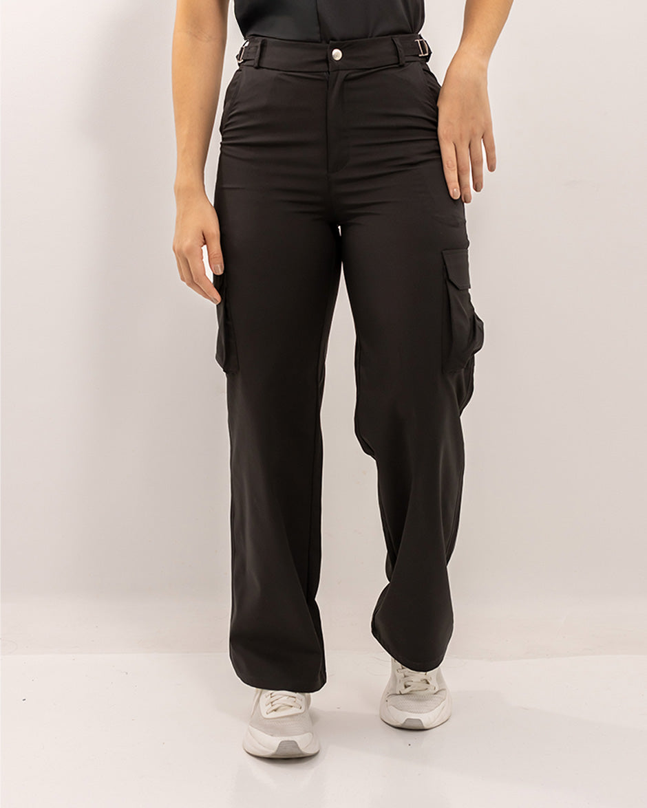Pantalón bota ancha, con múltiples bolsillos, con pretina lisa y detalles con hebillas que te harán ver elegante y sofisticada.